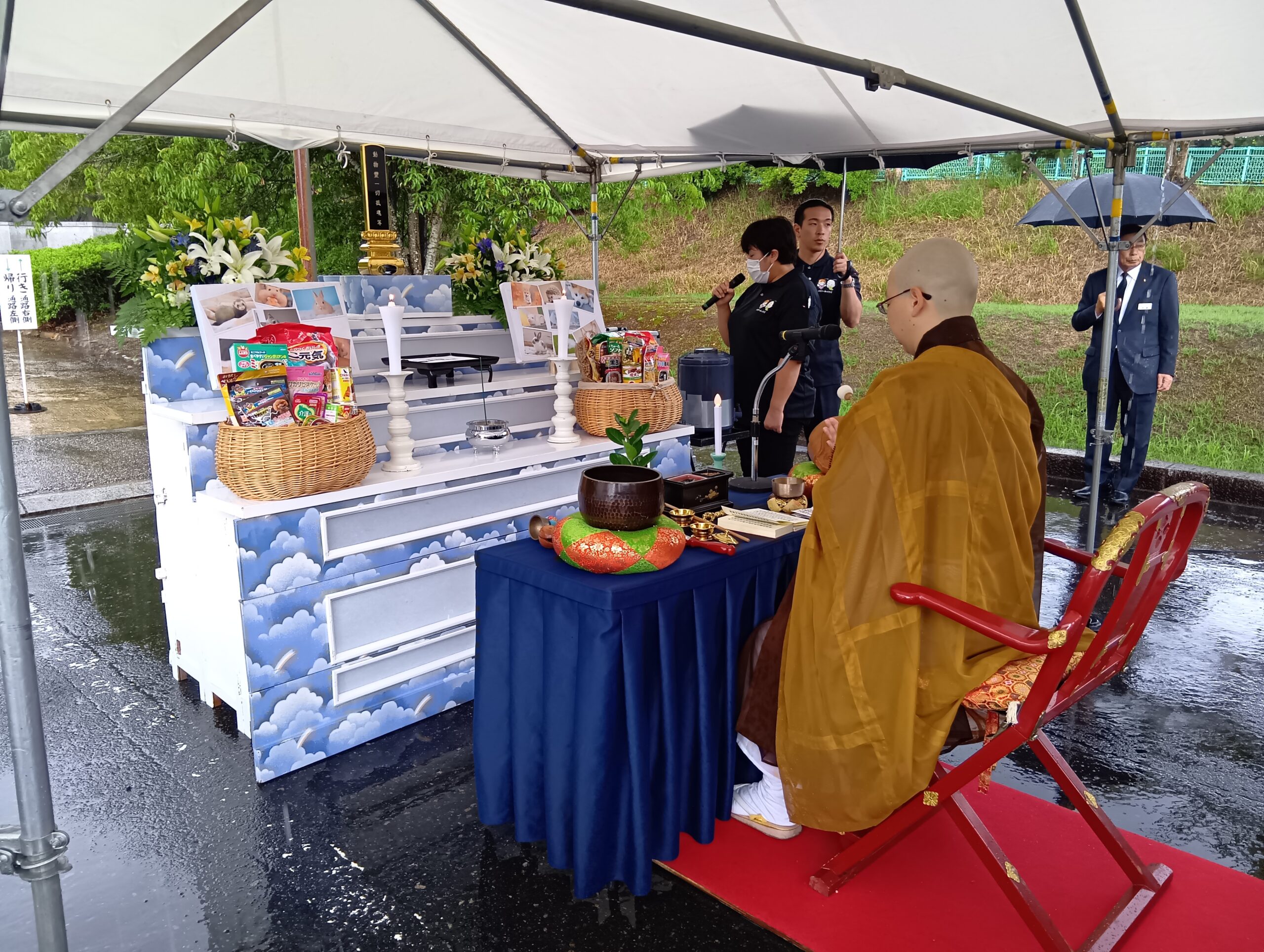 一時、あいにくの雨模様となりましたが、次第に雨も上がり無事に法要を営むことができました。早朝より多くの方々にお参りいただき、しとやかな雨の中にも温かな祈りが広がり、会場全体がやさしい想いに包まれておりました。かわいがってこられた大切なご家族を偲び、変わらぬお気持ちを寄せてくださる皆さまのお力添えによって、この法要を重ねてこられましたことを、心より厚く御礼申し上げます。