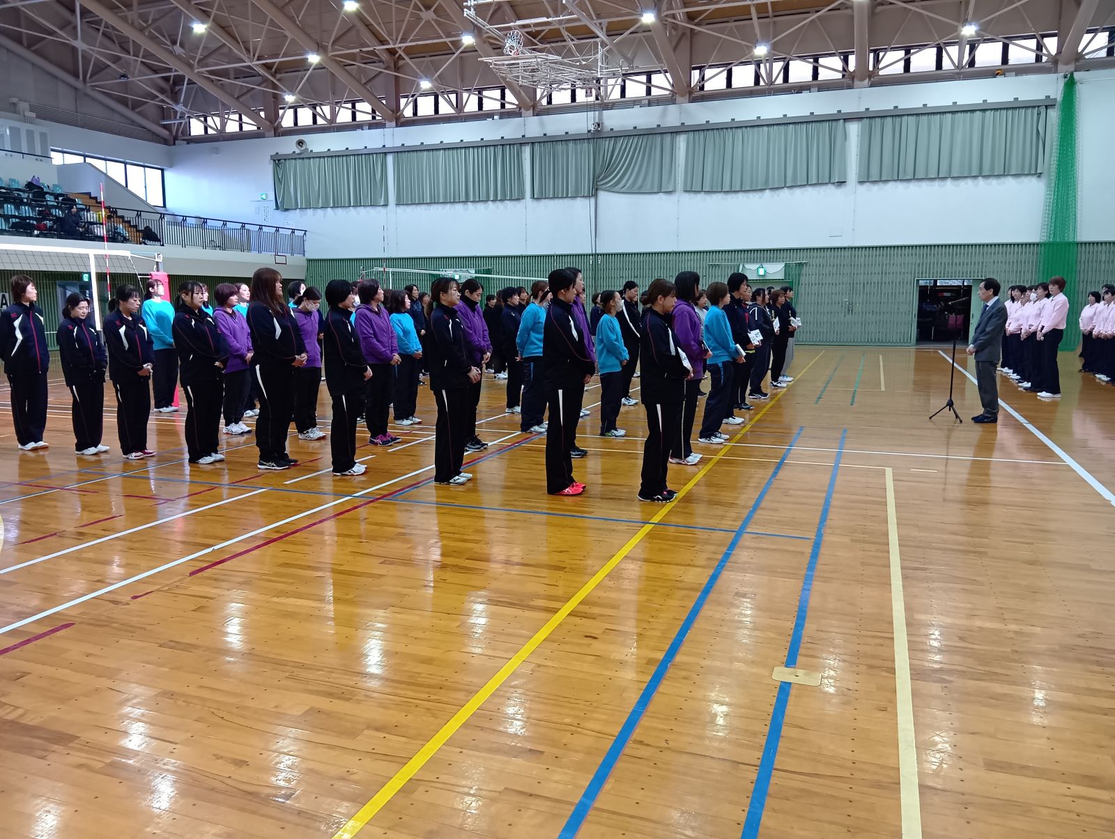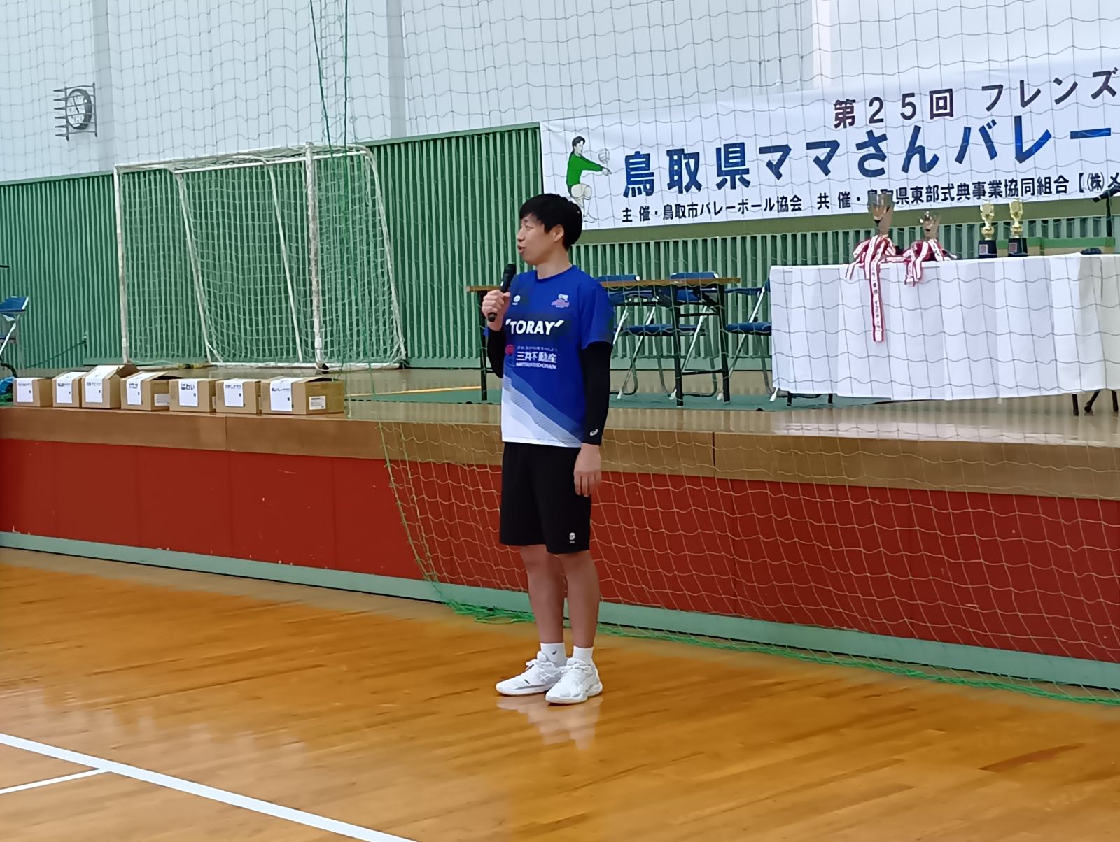 開会式では、鳥取市バレーボール協会の岡田信俊会長、鳥取県東部式典事業協同組合の光浪房夫理事長から挨拶がありました。また、人気企画「ミニバレー教室」も開かれ、元バレーボール日本代表選手の米山裕太さんと一緒に、ウォーミングアップをしたり、スパイクを披露してくださったりと、とても楽しい時間を過ごさせていただきました。