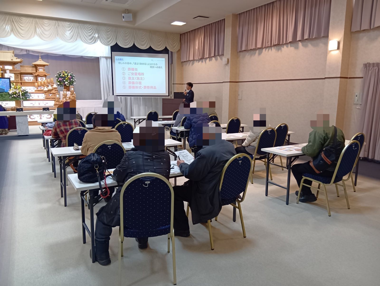 この度はご葬儀に関する質問が多かった印象でした。葬儀の時にこうしてあげたい、ああしてあげたいという意向をお持ちで、実際にできるのか質問を準備してこられた方もありました。相談会は服部と久末の会館で交互に開催しておりますので、今回参加できなかった方も心配ご無用。もちろん相談会の時でなくても、いつでもご連絡いただければ見学や疑問にお答えいたします。お悩みやご不安に寄り添いお力になれるようサポートいたしますので、お気軽にお声がけください。