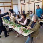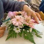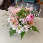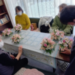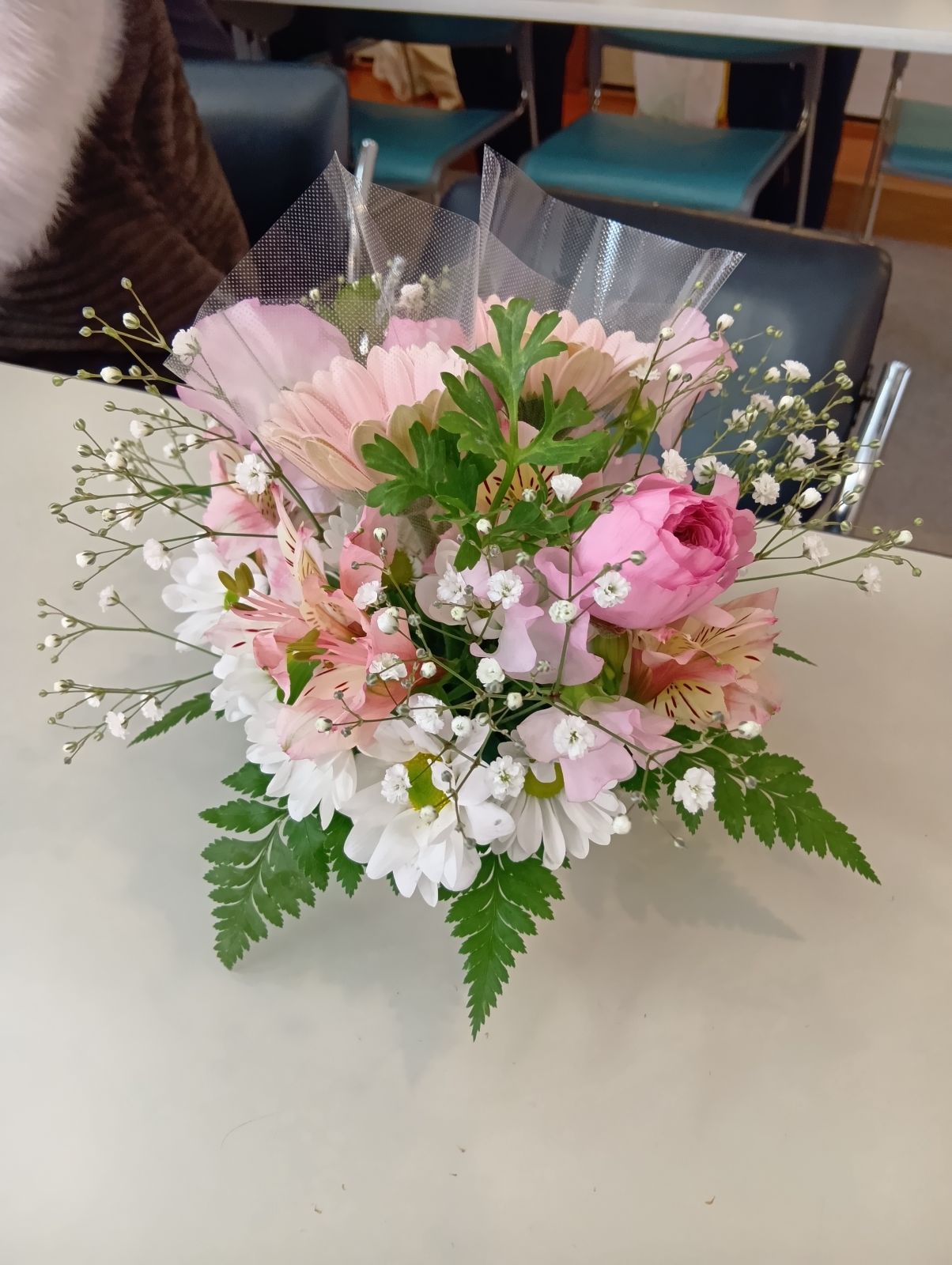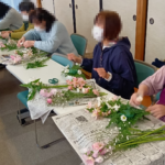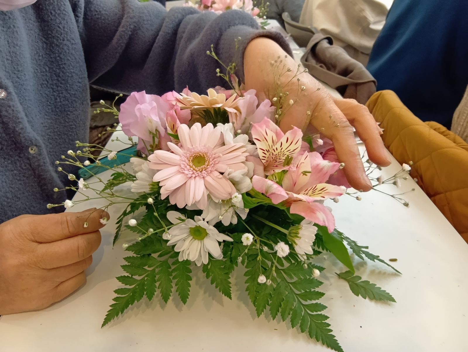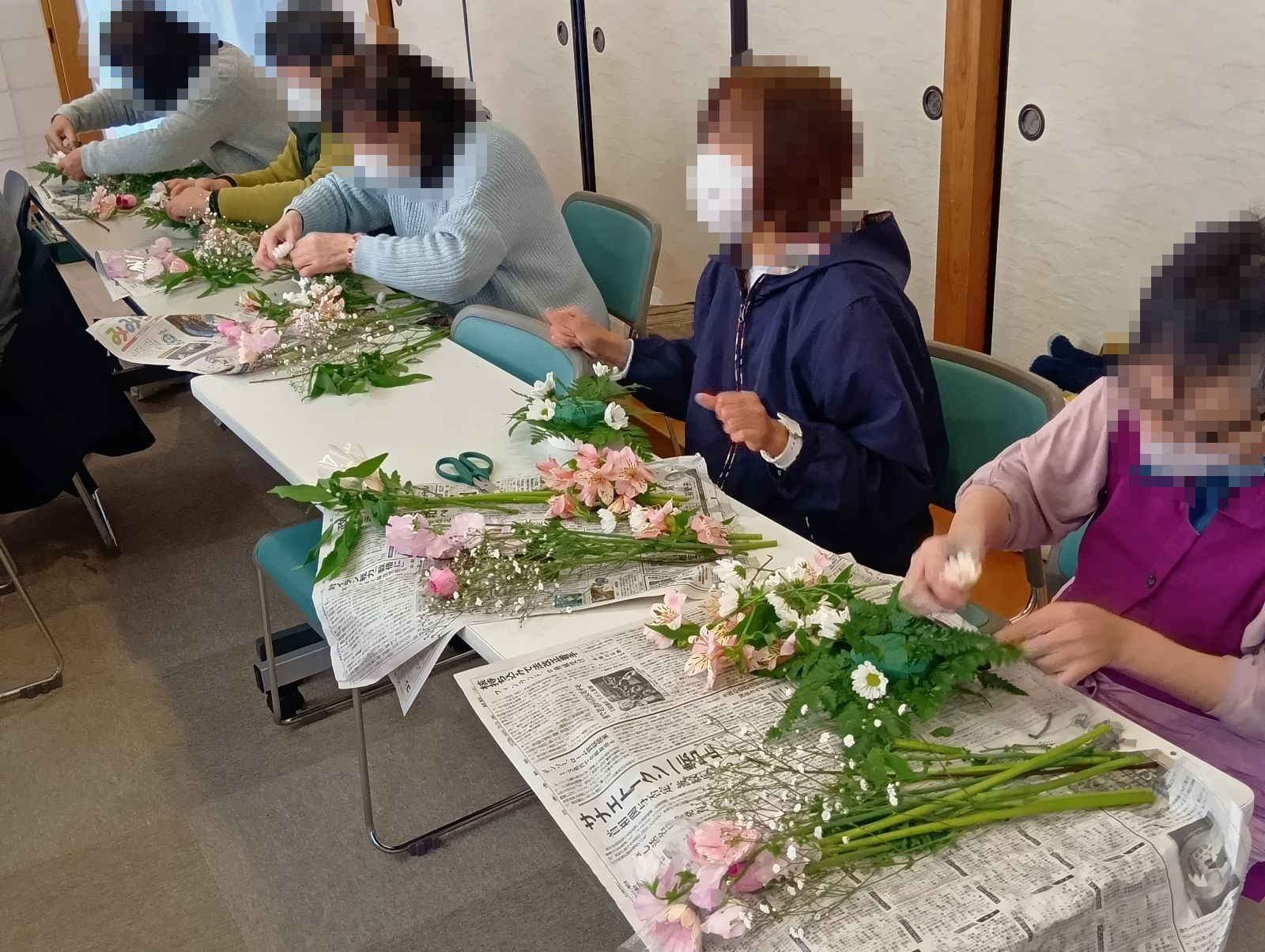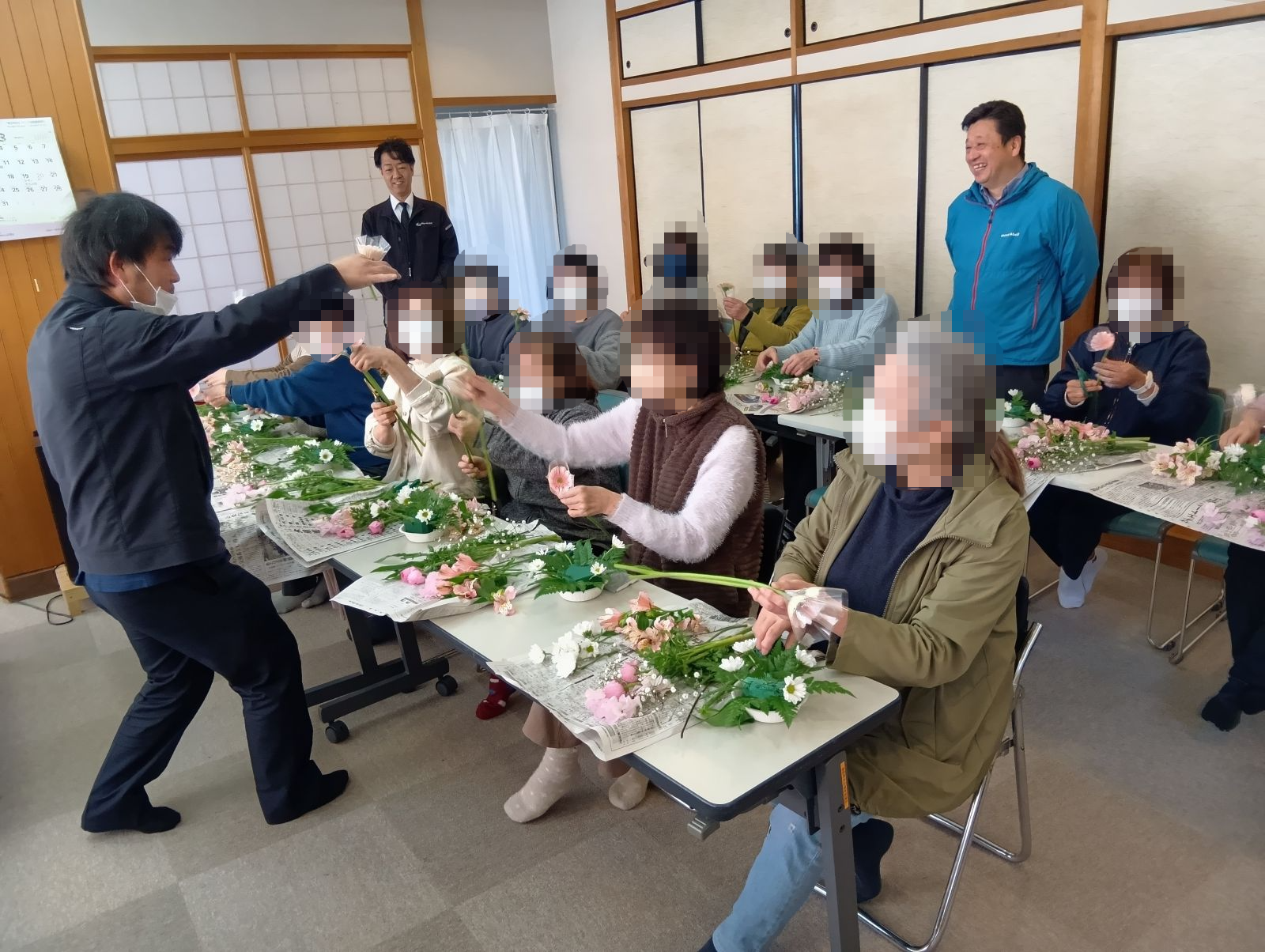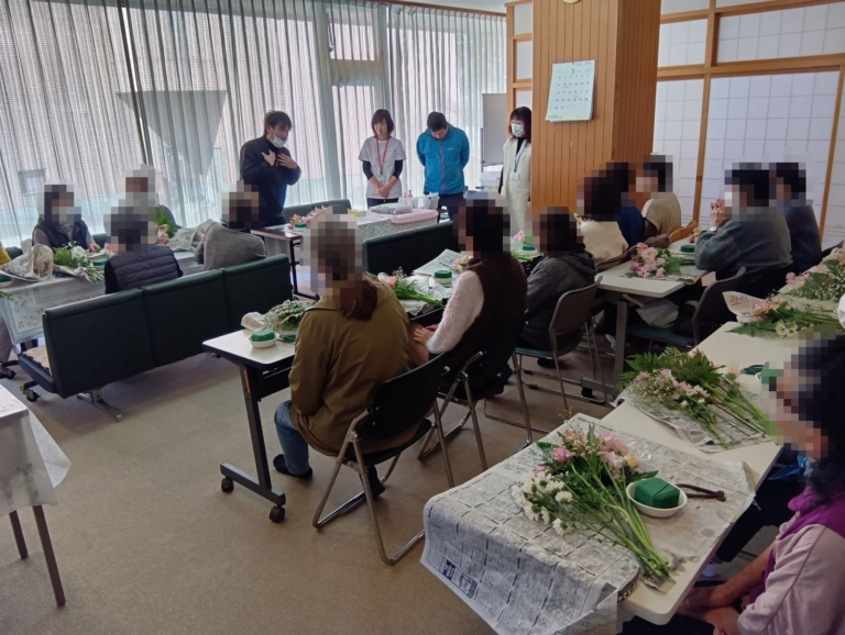 令和8年3月11日、河原町コミュニティセンターで開催された「たまりばカフェ よっといで!!」に参加しました。この活動は河原町地域福祉推進協議会様独自の取組で、地域内のどなたでも世代を超えて立ち寄り、利用していただける集いの場所として、”イベントの日”、”コーヒーカフェの日”の月二回開催されています。今年も合同会社ライフケアーズさんにお誘いいただき、ミニアレンジフラワー作りで弊社の生花スタッフがお手伝いさせていただきました。実際にお花をオアシスに挿しながら基本の作り方を説明して、あとは皆さんが思い思いに進めていきます。見本を見ながら長めに挿される方や短めに挿される方、様々ですがどれもかわいらしく自然と会話も弾みます。ビューティタッチセラピストによるハンドセラピー体験もあり、とても賑やかく楽しい時間となりました。