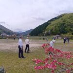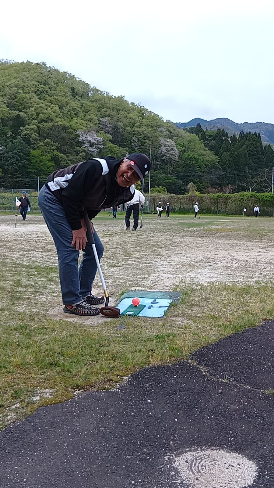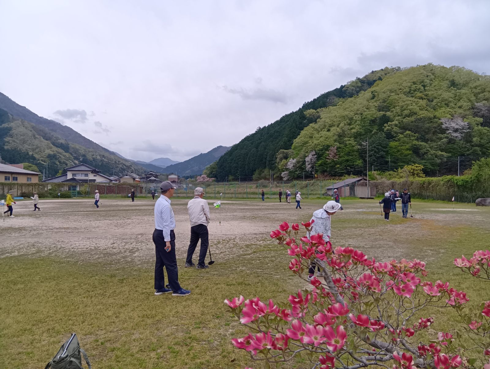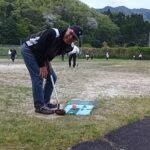 風が時折強く吹く中ではありましたがなんのその、ホールインワンが次々に飛び出す展開になりました。今回も休憩をはさみながら8ホール3ゲームを無事に終えることができました。上手な方は打つ方向も強さも安定していて、全く歯が立ちません。グラウンド脇を汽車が通ったり、レンゲ畑やハナミズキ、藤棚があったりと、のどかな雰囲気の中でプレーを楽しみました。