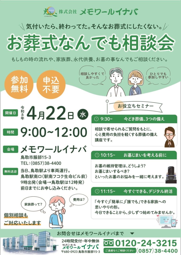 令和8年4月22日㈬鳥取市服部のメモワールイナバにて、「お葬式なんでも相談会」を開催いたします。当日はお葬式専門スタッフによる個別相談・展示見学・セミナーすべてご予約不要です。(お時間に制約のある方の個別相談は、事前予約のご予約をお薦めいたします。)些細とおもわれずお葬式の事は、なんでもご相談ください。