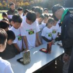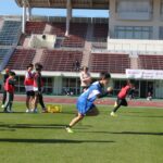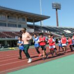 今回の講座には県東部を主とする小学3年生から6年生までの学生とクラブチーム生総勢50名以上に参加いただきました。秋晴れの清々しい天候のもと、競技場のトラックや芝生エリアを使って2時間以上にわたり取り組みました。講座は腿上げなどのアップから始まり、2チームに分かれての”氷鬼”のようなゲームなど、中々にハードながら子どもたちは楽しそうに夢中で取り組んでいました。