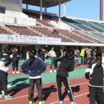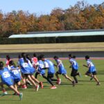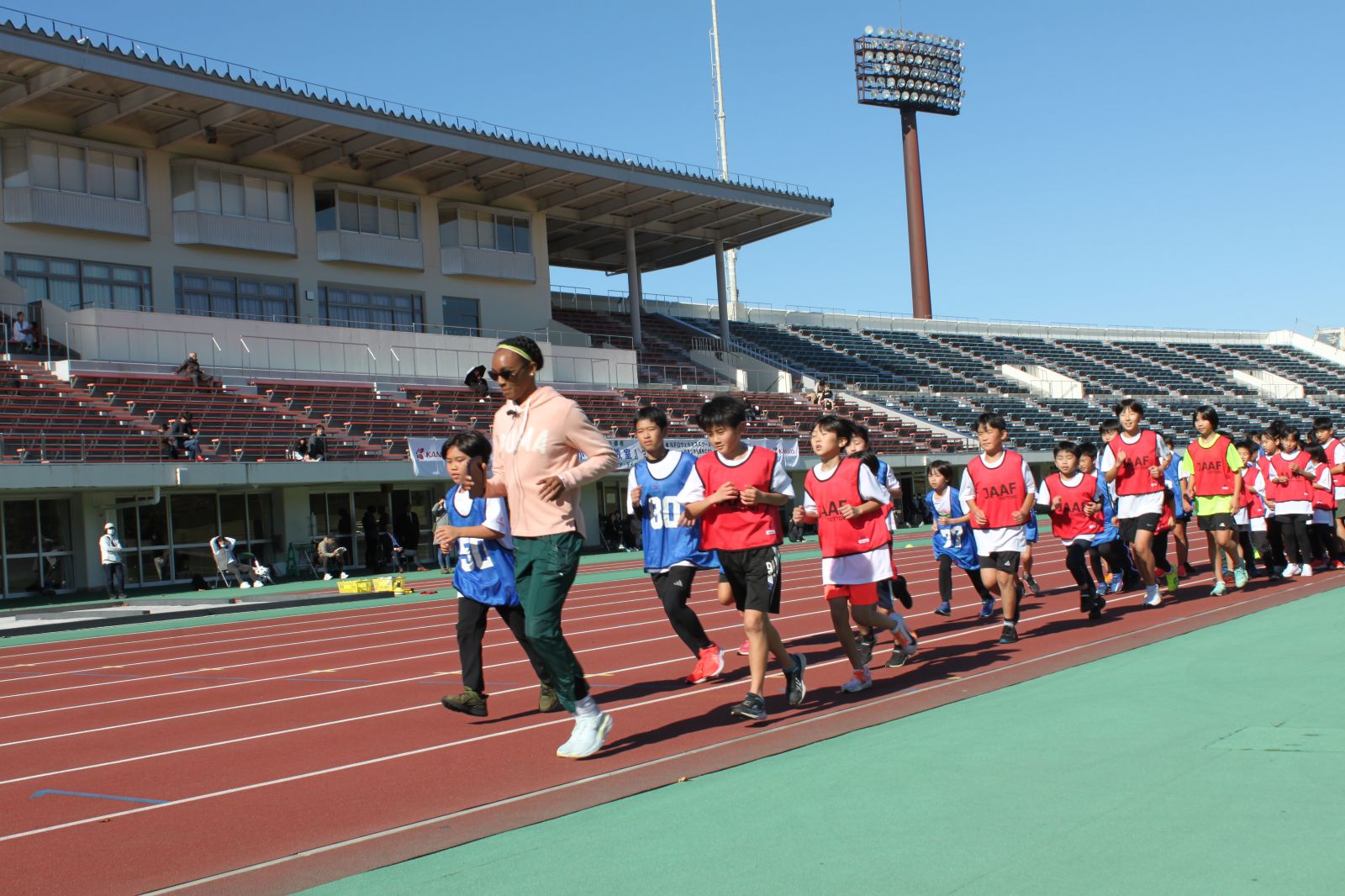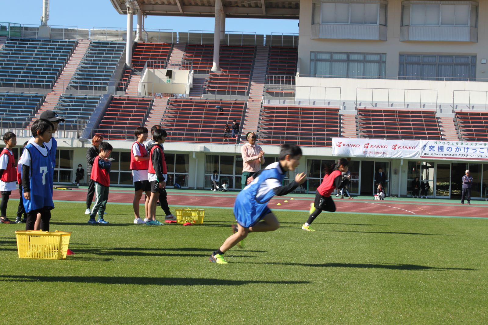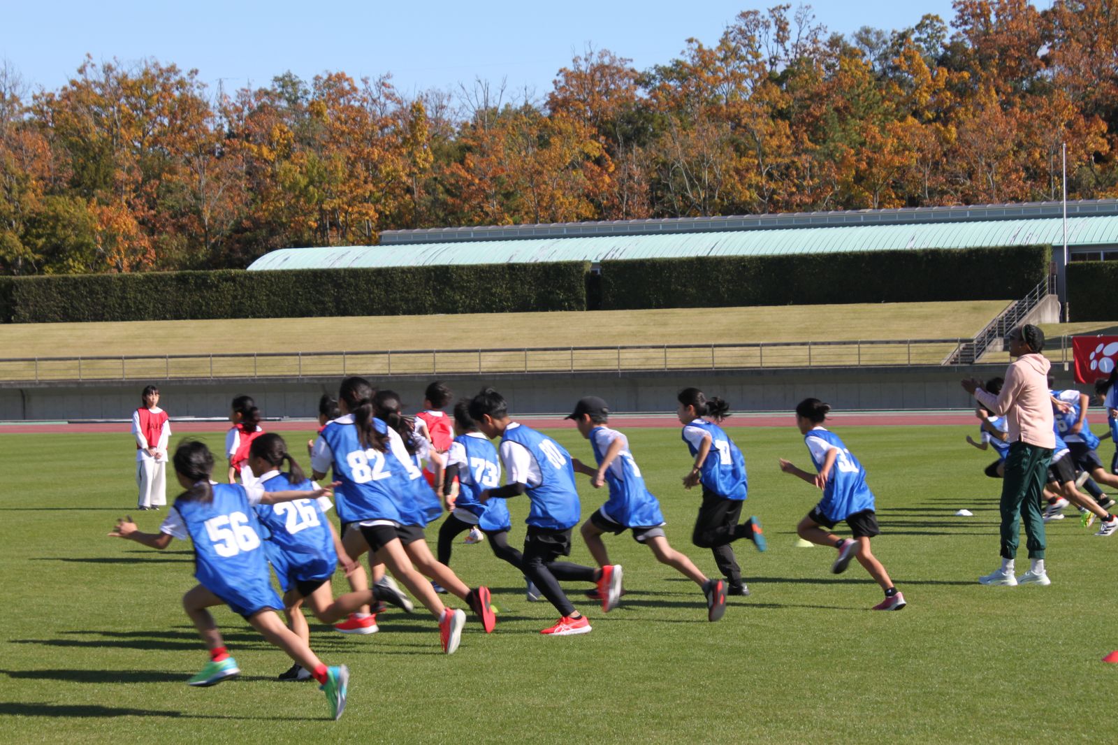 今回の講座には県東部を主とする小学3年生から6年生までの学生とクラブチーム生総勢50名以上に参加いただきました。秋晴れの清々しい天候のもと、競技場のトラックや芝生エリアを使って2時間以上にわたり取り組みました。講座は腿上げなどのアップから始まり、2チームに分かれての”氷鬼”のようなゲームなど、中々にハードながら子どもたちは楽しそうに夢中で取り組んでいました。